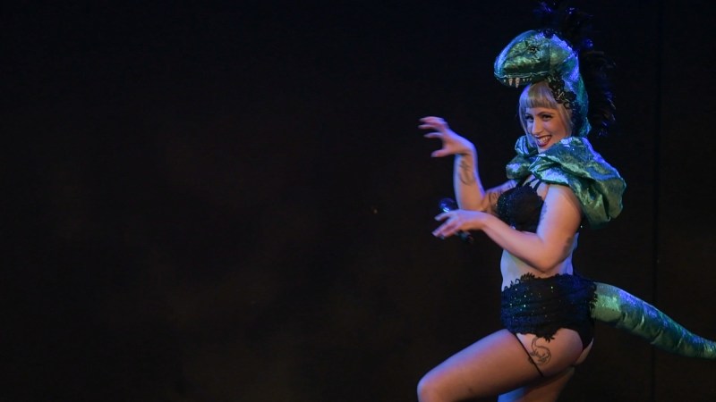 I first saw Lena’s dinosaur act about a year ago at Cabaret Roulette ‘Evolution’. Back then it involved a bacofoil dino head and a cardboard tail (is that right?)…so I wasn’t too sure what to expect this time around. I took a pot shot and guessed ‘Raver hair and a Jurassic Park onesie!