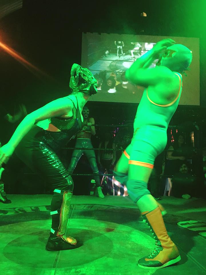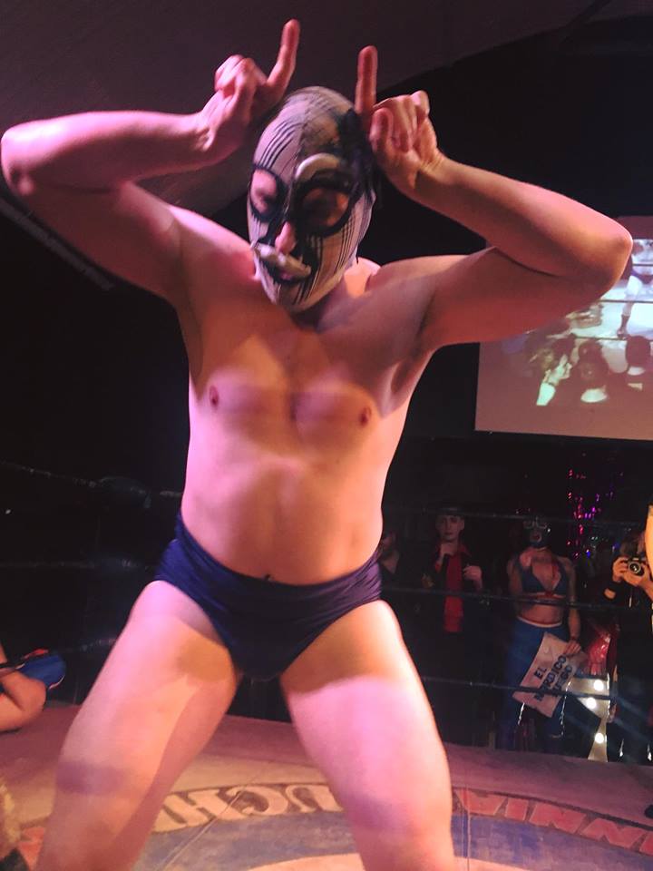 People wander around in Lucha masks: there’s a man in a horses head, another in a sombrero. There’s a mixture of other clothing: street clothes, plaid, beards, big moustaches, leather, latex, and a few ladies in alluring dresses.