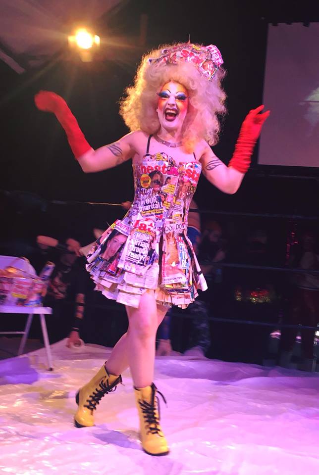 Marnie strides into the ring…BIG HAIR, yellow boots, a dress fashioned from tabloid magazines.