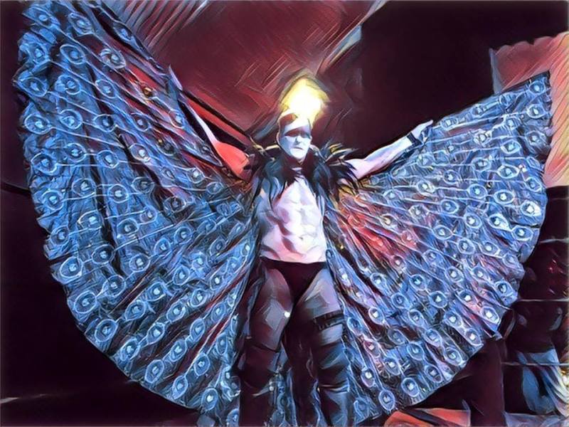 Pavo poses in the ring: a mask of broken mirrored pieces, a big black cape, a cane, and a definite sense of malevolence. Pavo sweeps his cape around; he’s intense and ready for action.
