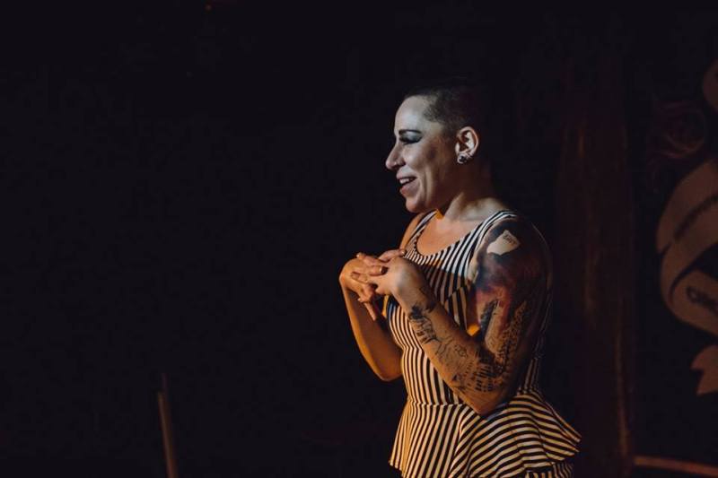 Smashlyn bounds onto the stage: bald head, tattoos all over, and black silk fans in her hands…