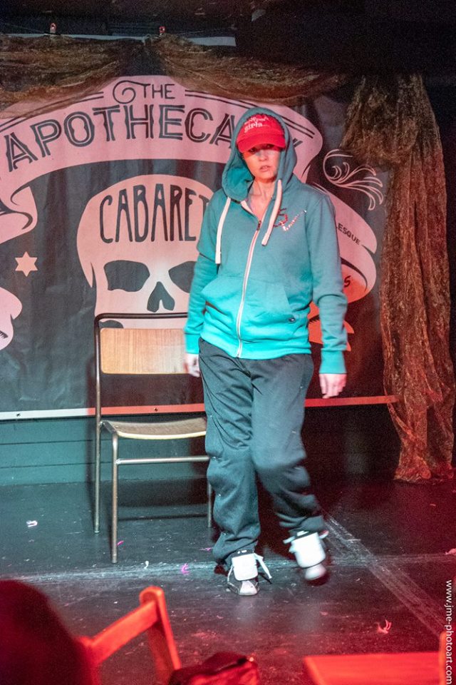 This lady bounced onto the stage in a baseball cap and a hoodie… it was either call the police or enjoy the show.